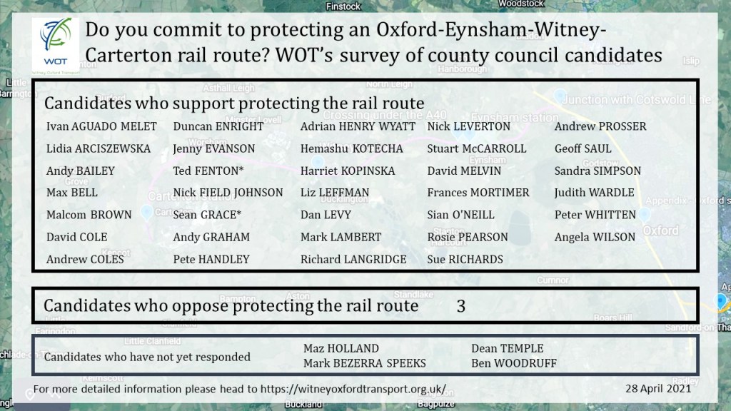 The May 6th local elections will be held in two weeks’ time. WOT has approached local candidates asking them to pledge to preserve a rail link with a simple question: “do you support defining and protecting a rail route as an integral part of the planned A40 Works project and will you vote in support of this at Council meetings?”