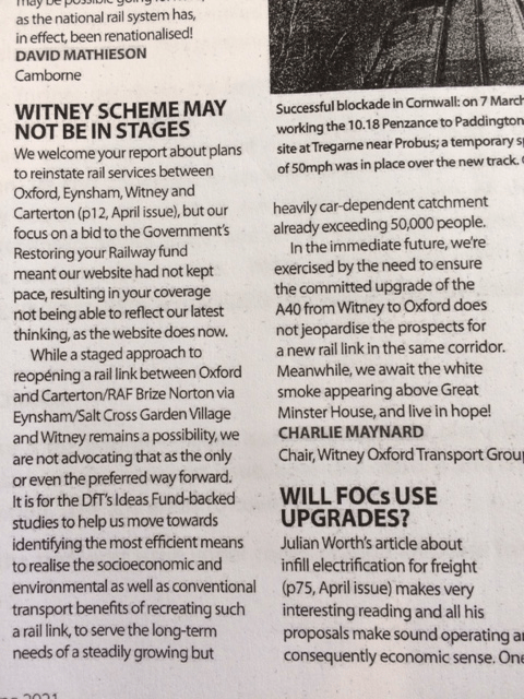 Don’t let West Oxfordshire remain the county’s forgotten corner. Join our campaign for a railway from Oxford to Witney and Carterton before it is too late (witneyoxfordtransport.org.uk).